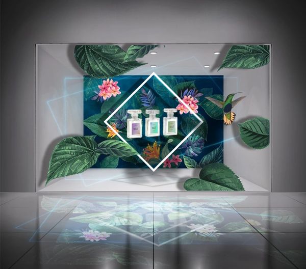 The Immersive Display Design below; combines a 2D Background Screen with an Actual 3D Product, 3D Decorating nature elements immersed into Led light effect with sensory Music.